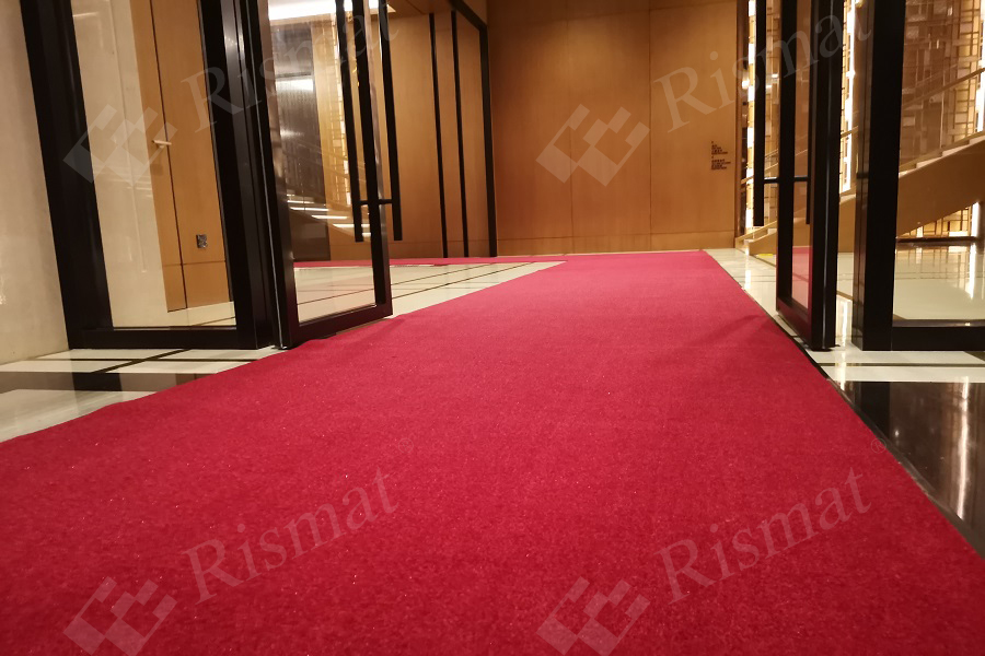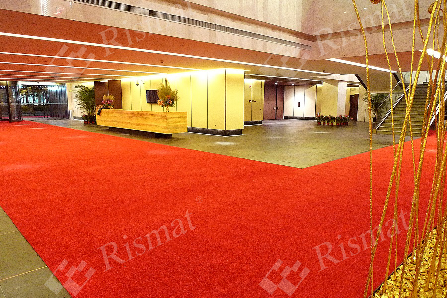 豪华贵宾地垫特有的皇家红毯面及橡胶底是用于接待贵宾的最佳地面材料。是为了高档场所、四五星级酒店和高级会所而设计的卷装地垫,可铺设于大堂和通道等处,亦有单块可供选择。此产品不但有效地去污和藏垢,贴地性好,脚感舒适且易于清洁及存放。