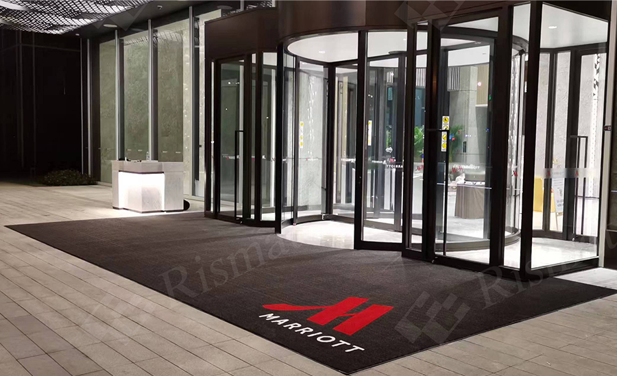 万豪酒店入口处铺设的定制品牌logo垫,兼顾耐用性与视觉质感,既过滤鞋底沙尘,又以品牌符号传递高端形象,成为宾客抵达时的视觉焦点。
