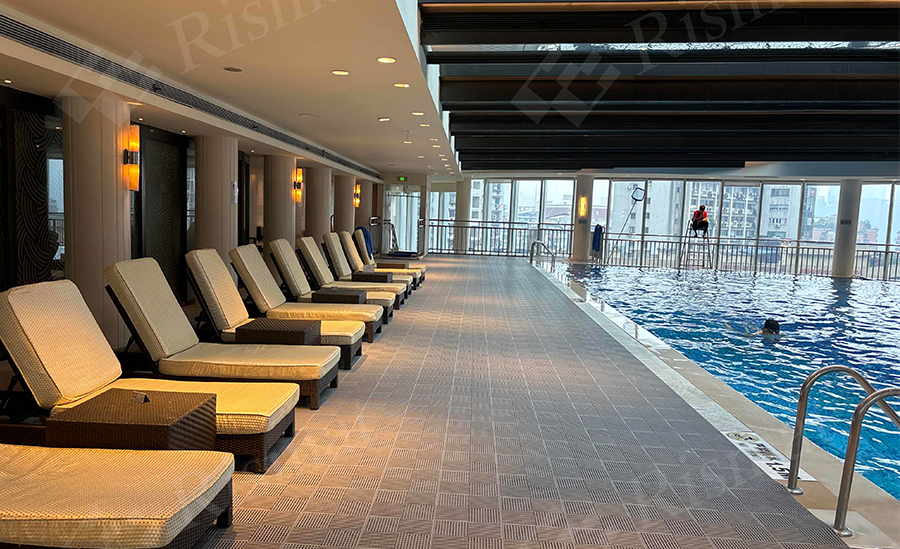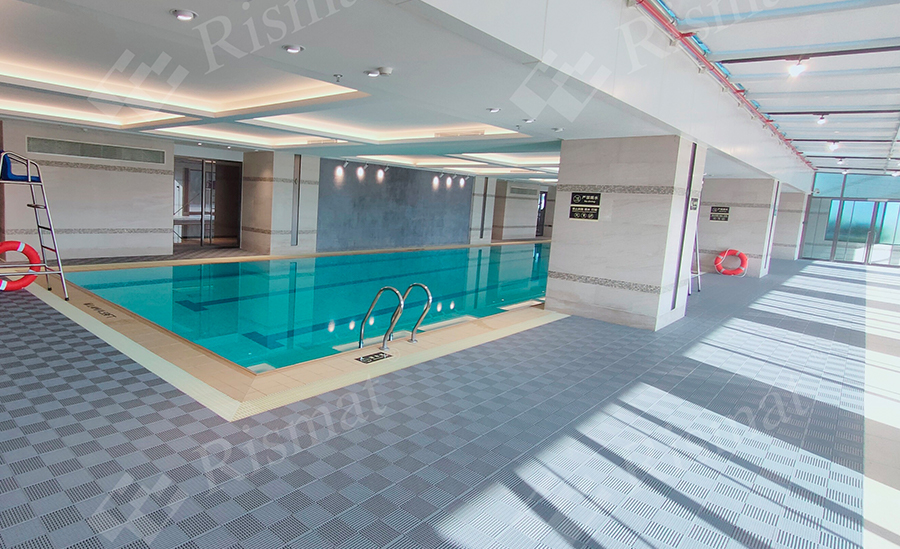 泳池周边及更衣室铺设的环保防滑垫,优异的吸水、快干、防滑性能,即使在潮湿的环境下也能保持地面的干燥和清洁。模块设计不仅易于安装、移动和清洁,更为宾客带来舒适脚感。