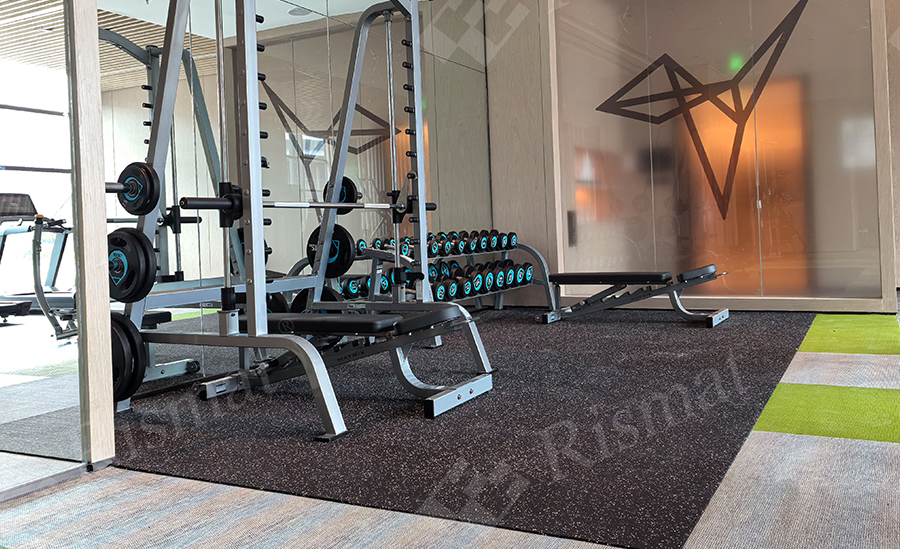 健身区域选用高密度橡胶抗震垫能有效吸收跑步机、力量器械冲击力,回弹性高,降低关节压力,防滑纹路确保高强度训练安全。