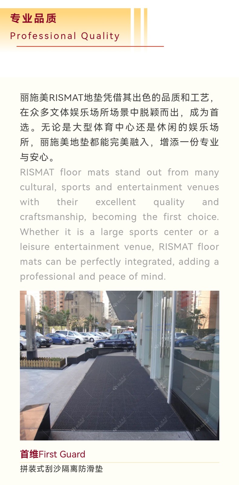 在高端办公物业场景中,地垫不仅是功能载体,更是企业形象与安全管理的延伸。丽施美RISMAT通过"功能+美学+定制"三维创新,将地垫升级为空间管理工具,成为高端办公场所地面解决方案的优选品牌。