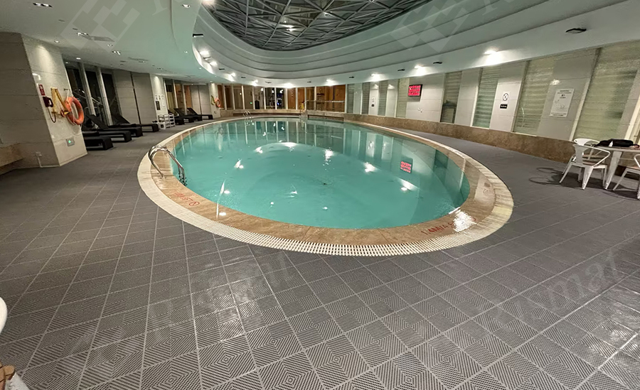 泳池环保防滑垫:安全与生态的双重承诺,特有的高科技设计,安全防滑,保持地面干净清爽。其最大的功能在于防滑、阻燃、抗紫外线以及强效抗菌。模块型设计不仅易于安装、移动和清洁,更为宾客带来舒适脚感。