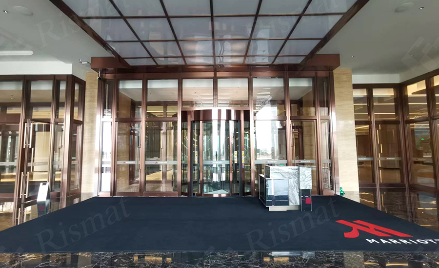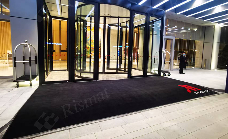 万豪酒店入口处铺设的定制品牌logo垫,兼顾耐用性与视觉质感,既过滤鞋底沙尘,又以品牌符号传递高端形象,成为宾客抵达时的视觉焦点。