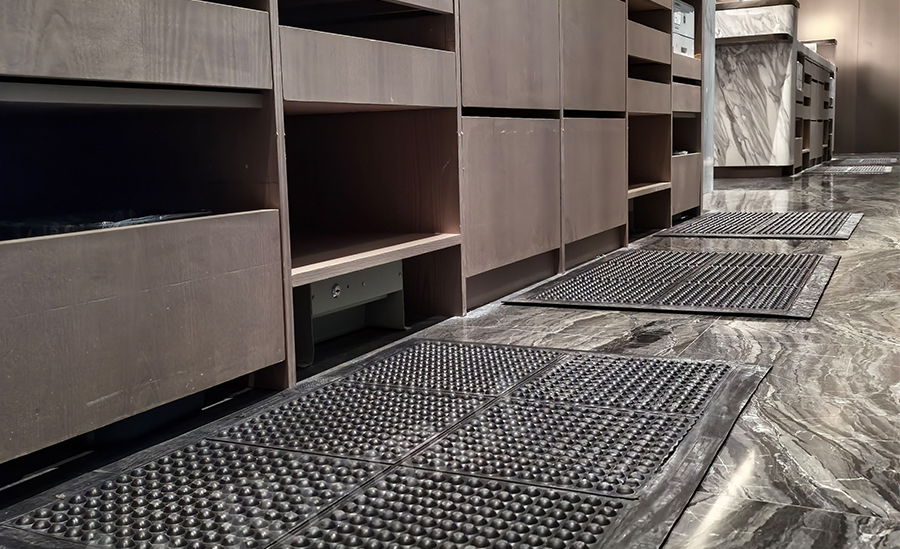 前台接待区域铺设橡胶舒缓垫。它底部与表面的形状设计,是专为长时间站立者考量。创新设计融入人体工学原理,能完美契合人体站姿,有效分散腿部压力,带来舒适体验。