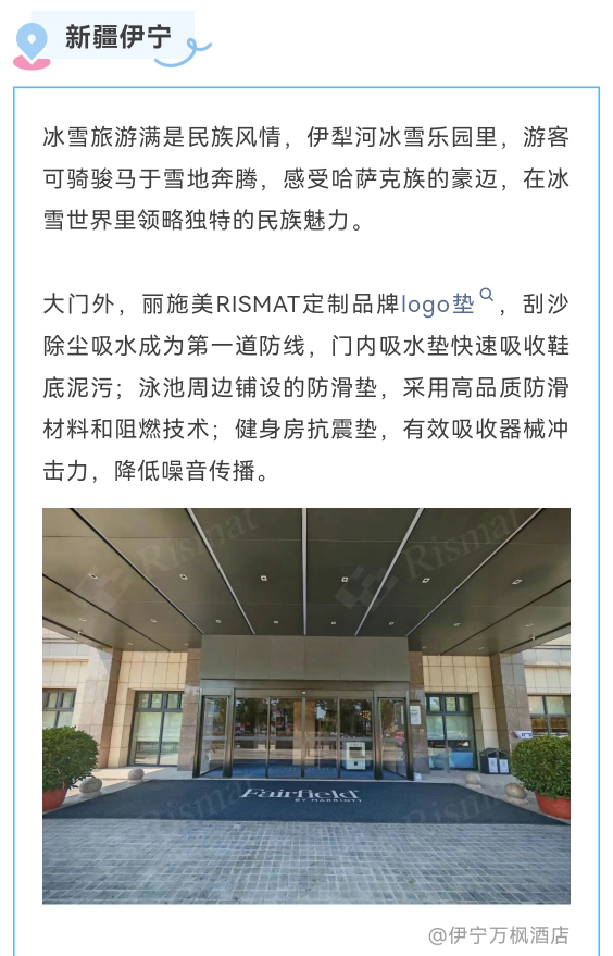酒店地面清洁向来是难题:门外泥沙带进来、通道脚印擦不完、泳池卫生间易打滑、后厨油污难清理…… 丽施美 RISMAT 专业地垫,从门口到室内各功能区,一站式解决地面污染与安全隐患!